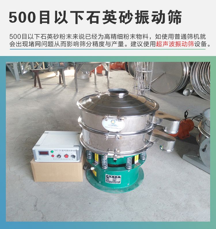 對于500目以下石英砂粉末來說已經為高精細粉末物料,如使用普通篩機就會出現堵網問題從而影響篩分精度與產量。對于該類型的石英砂產品就需要使用到另一款篩分設備-超聲波振動篩。該系列篩機的清網裝置使用的是超聲波系統,開啟后篩面會形成一個高頻低振幅的超聲振動波,使高精細粉末低空懸浮在篩面粗從而實現清網及解決堵網問題。