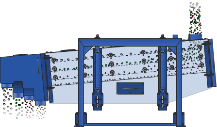 設備的篩箱在慣性力的作用下作前后往復運動,并帶動篩面做周期性搖動,迫使篩面上的物料隨篩箱一同做定向跳躍式運動,小于篩面孔徑的物料通過篩框落到下層,稱為篩下物,大于篩面孔徑的物料經連續(xù)翻滾跳躍運動后從排料口排出,完成篩分作業(yè)。