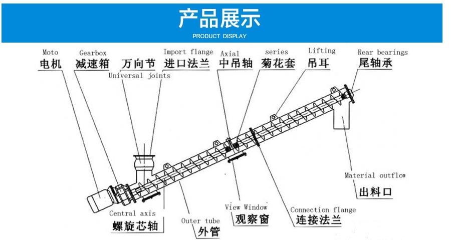 LS型螺旋輸送機結(jié)構(gòu)特征,一臺螺旋輸送機通常由本體、進出裝置、驅(qū)動裝置三大部分組成。本體由首節(jié)、中間節(jié)、尾節(jié)三種組成。在首節(jié)內(nèi)裝有支推軸承承受軸向力,在中間節(jié)和尾節(jié)內(nèi)裝有用軸承支承螺旋軸,此外,在尾節(jié)內(nèi)還裝有可軸向移動的徑向軸承以補償螺旋軸長度的誤差和適應(yīng)溫度的變化。各螺旋軸之間采用法蘭式聯(lián)接,提高聯(lián)接軸的互換性,便于維修。