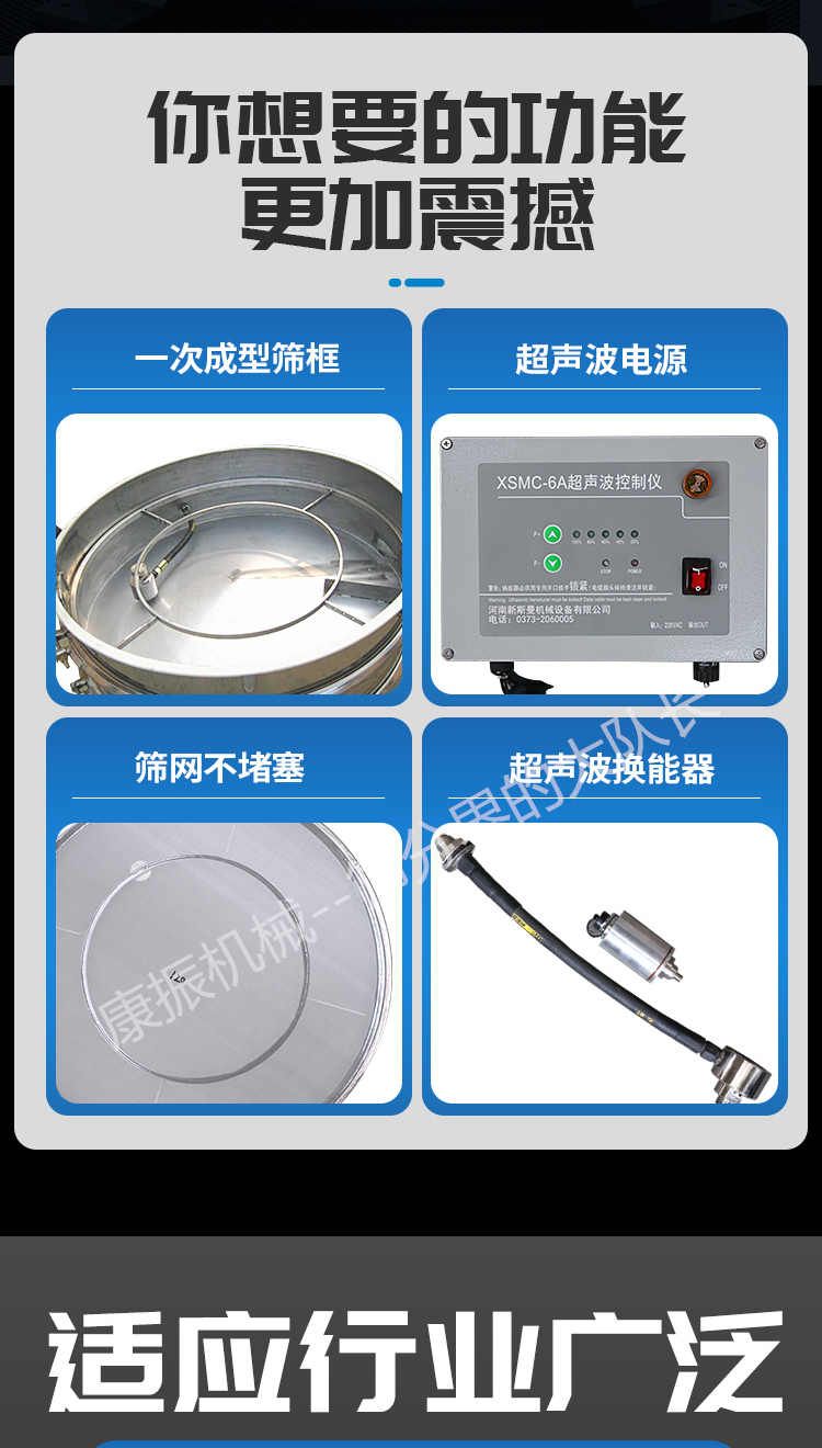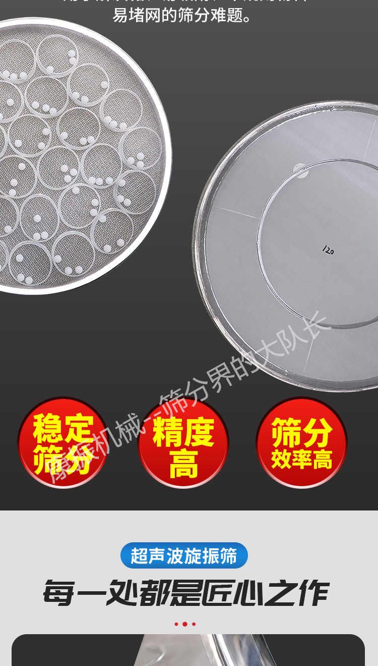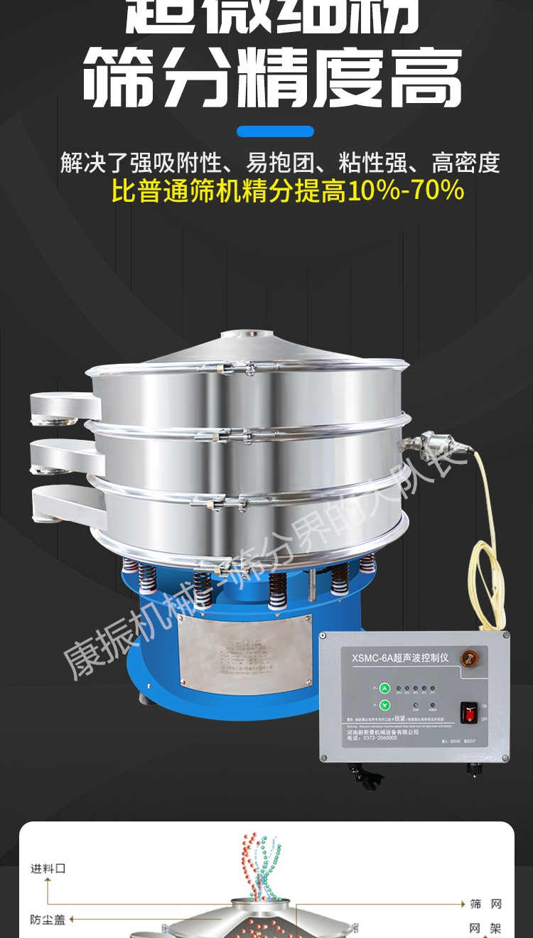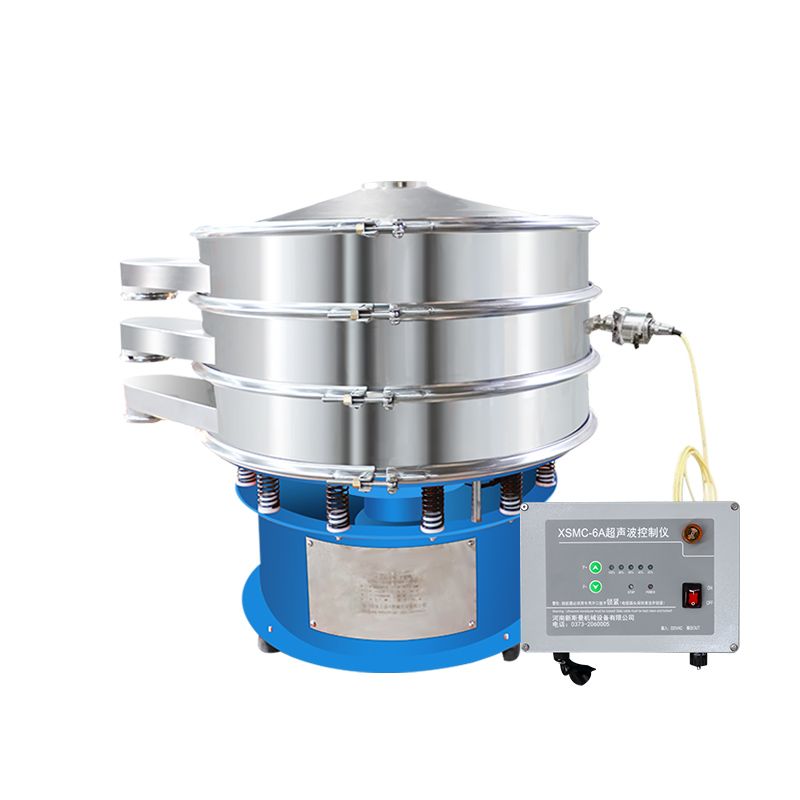 超聲波振動篩是在旋振篩的基礎(chǔ)上引入了超聲波清網(wǎng)裝置,通過將220V、50Hz或110V、60Hz電能轉(zhuǎn)化為18KHz的高頻電能,輸入超聲換能器,將其變成18KHz機械振動,從而達到高篩分和迅速清網(wǎng)的目的,使超微細粉篩分成為易事。該系統(tǒng)在傳統(tǒng)的振動篩基礎(chǔ)上在篩網(wǎng)上引入一個低振幅、高頻率的超聲振動波(機械波),以改善超微細粉體的篩分性能。特別適合高附加值精細粉體的用戶使用。超聲波篩分系統(tǒng)是一種簡單實用、可靠的篩分系統(tǒng),是當前網(wǎng)孔堵塞的有效的解決方法。可廣泛應(yīng)用于制藥、冶金、化工、選礦、食品等要求精細篩分過濾的行業(yè),篩分過濾精度高,有效解決因團聚、靜電、強吸附性卡堵網(wǎng)孔等篩分難題,是國內(nèi)篩分行業(yè)的一項重大技術(shù)突破。