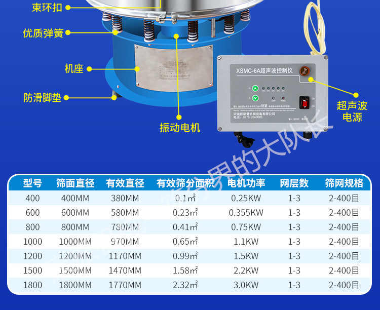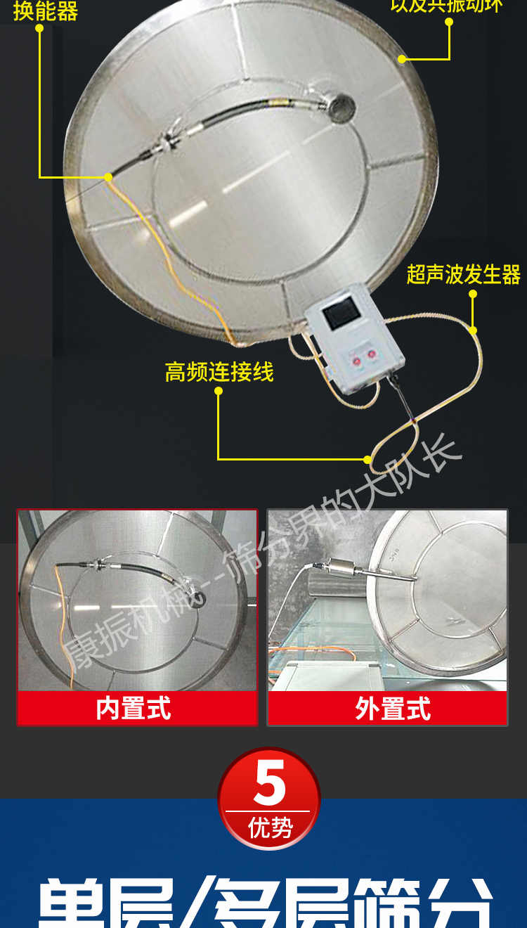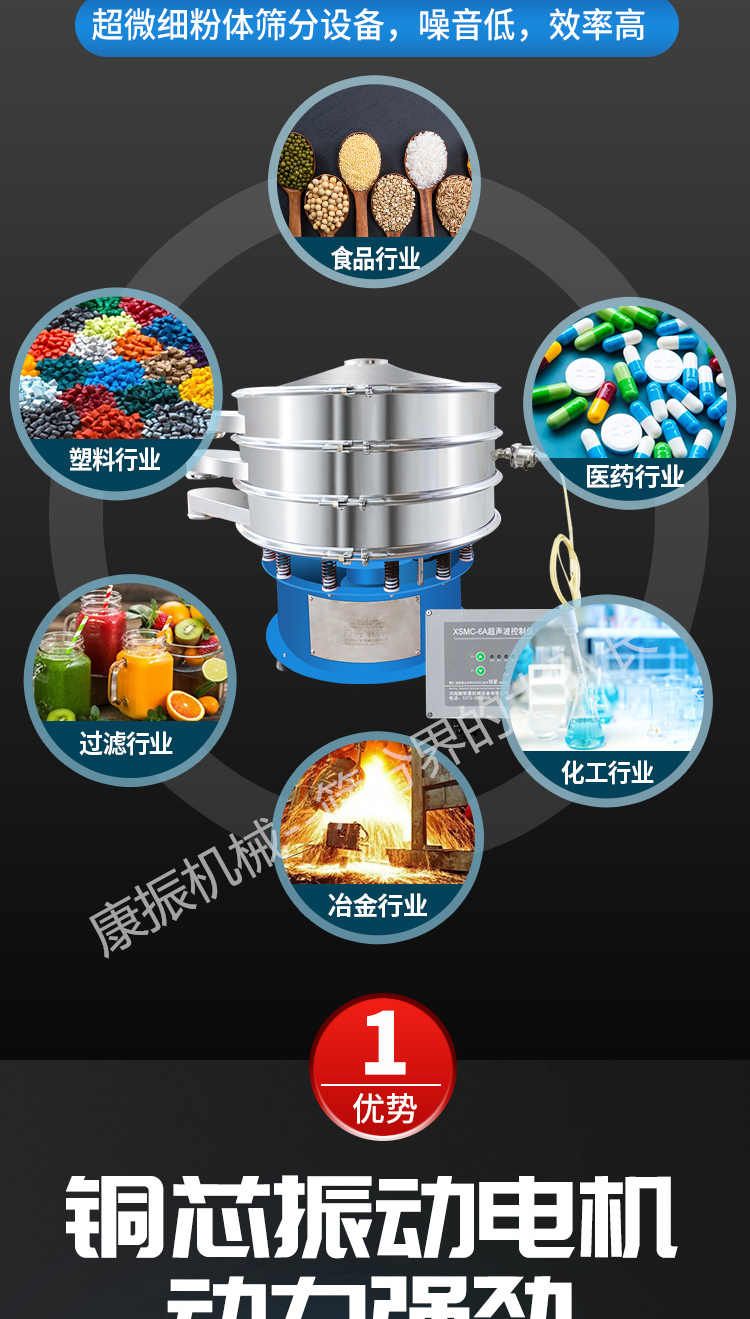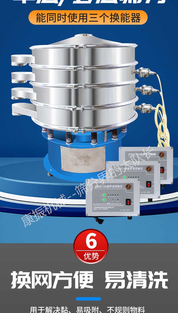 超聲波振動篩是在旋振篩的基礎(chǔ)上引入了超聲波清網(wǎng)裝置,通過將220V、50Hz或110V、60Hz電能轉(zhuǎn)化為18KHz的高頻電能,輸入超聲換能器,將其變成18KHz機械振動,從而達到高篩分和迅速清網(wǎng)的目的,使超微細粉篩分成為易事。該系統(tǒng)在傳統(tǒng)的振動篩基礎(chǔ)上在篩網(wǎng)上引入一個低振幅、高頻率的超聲振動波(機械波),以改善超微細粉體的篩分性能。特別適合高附加值精細粉體的用戶使用。超聲波篩分系統(tǒng)是一種簡單實用、可靠的篩分系統(tǒng),是當前網(wǎng)孔堵塞的有效的解決方法。可廣泛應(yīng)用于制藥、冶金、化工、選礦、食品等要求精細篩分過濾的行業(yè),篩分過濾精度高,有效解決因團聚、靜電、強吸附性卡堵網(wǎng)孔等篩分難題,是國內(nèi)篩分行業(yè)的一項重大技術(shù)突破。