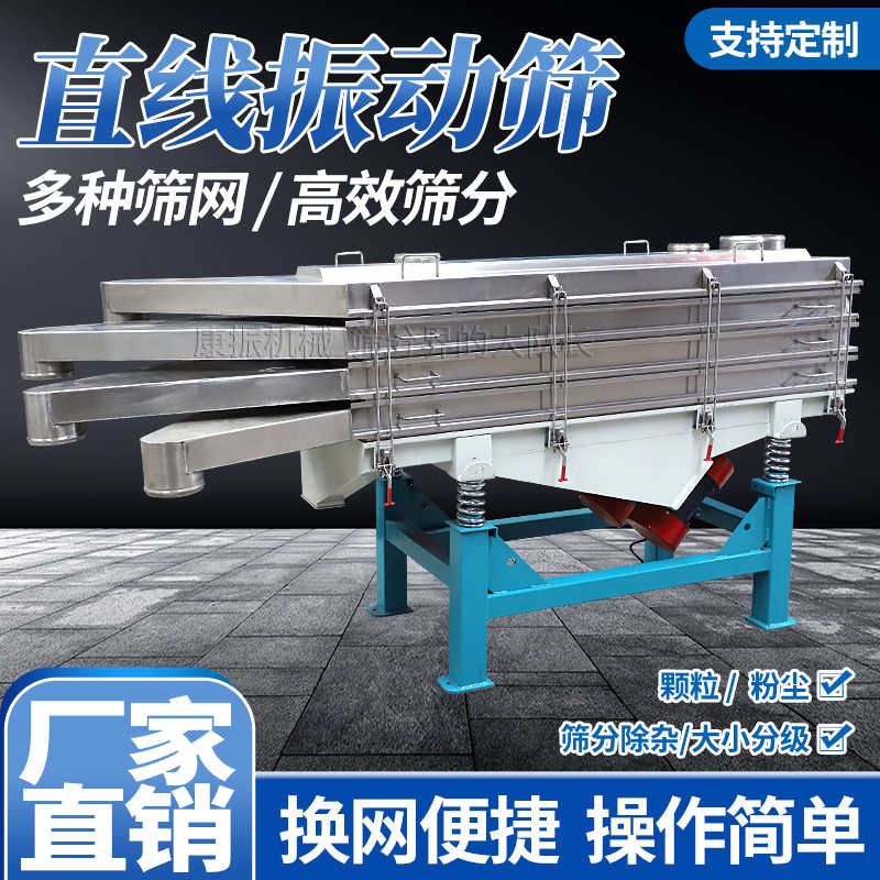 直線振動篩利用振動電機激振作為振動源,使物料在篩網上被拋起,同時向前作直線運動,物料從給料機均勻地進入篩分機的進料口,通過多層篩網產生數種規格的篩上物、篩下物、分別從各自的出口排出。具有耗能低、產量高、結構簡單、易維修、全封閉結構,無粉塵溢散,自動排料,更適合于流水線作業。