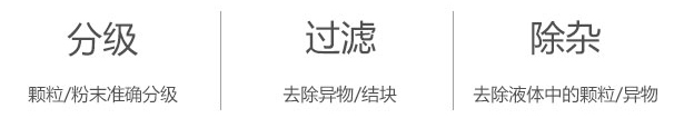 任何顆粒、粉末、粘液一定范圍內(nèi)均可篩選。篩分細(xì)至500目或0.028mm, 過濾小可至5微米。分級篩選,可篩一至五層篩網(wǎng),能同時進(jìn)行二至六個等級的分選或過濾。