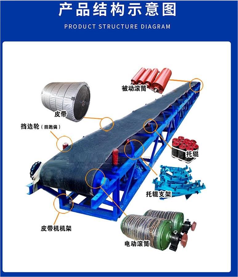 物料及袋裝物料,如煤、碎石、砂、水泥、化肥、糧食等。被送物料溫度小于60℃。其機(jī)長及裝配形式可根據(jù)用戶要求確定,傳動(dòng)可用電滾筒,也可用帶驅(qū)動(dòng)架的驅(qū)動(dòng)裝置。