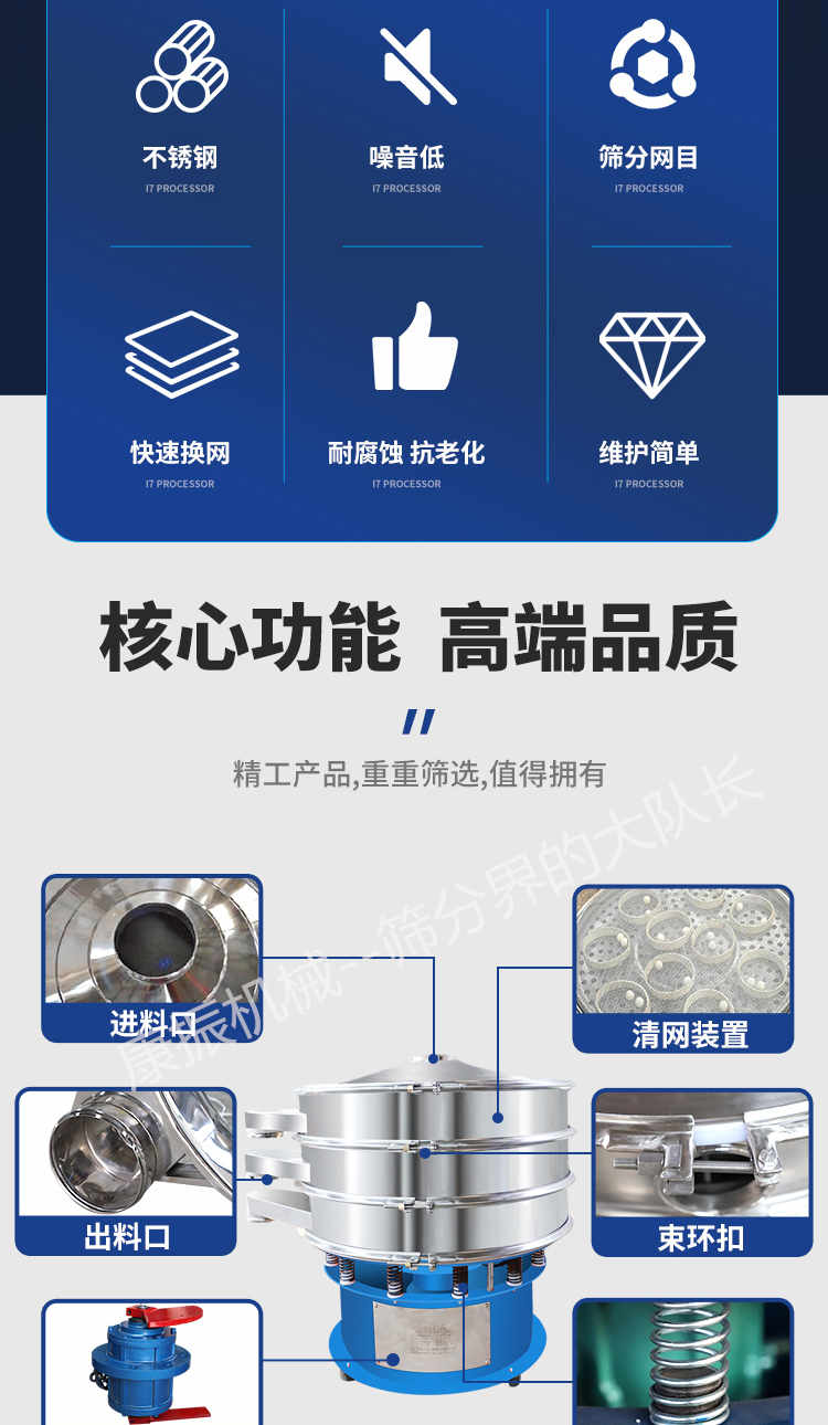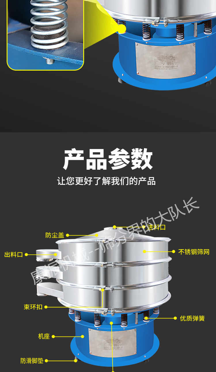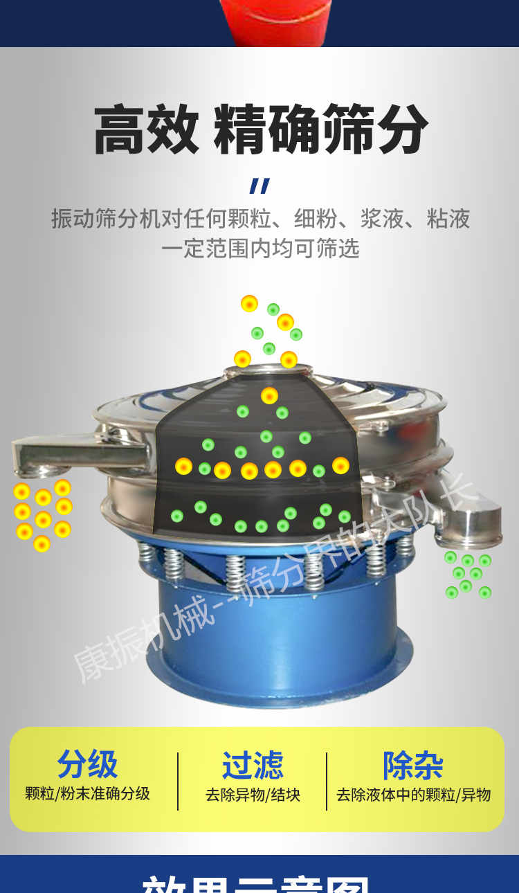3、去雜質:本設備可對大量物料,除去大小不同的小部分物料,進行快速分離。