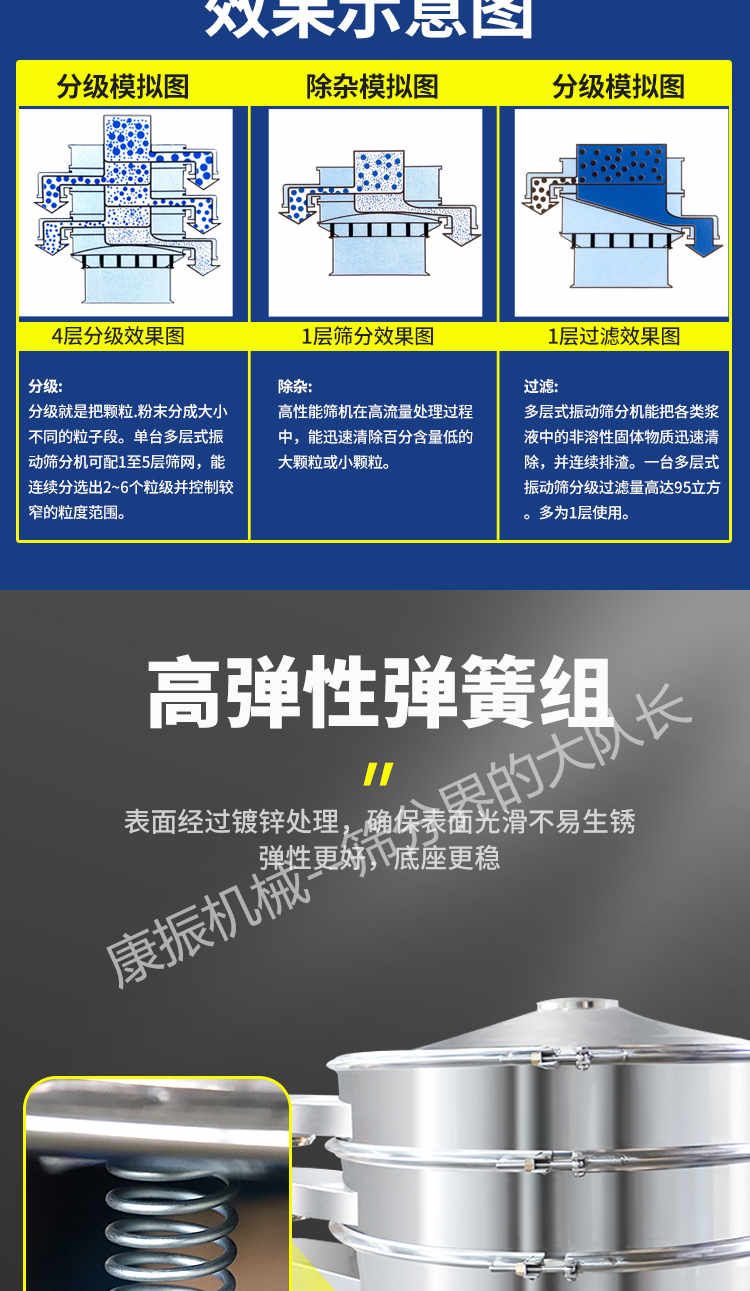 篩選范圍廣--只有系列三次元旋振篩能分選如此廣的原料范圍:任何顆粒、細粉、漿液都可以篩選。篩分細500目(28微米),過濾細5微米。網孔防堵塞--三次元振動功能及自動清理堵網裝置把堵網幾率降到小。 單層或多層分選--每臺旋振篩可選一至五層篩網,能同時進行二到六個等級的分選或過濾。